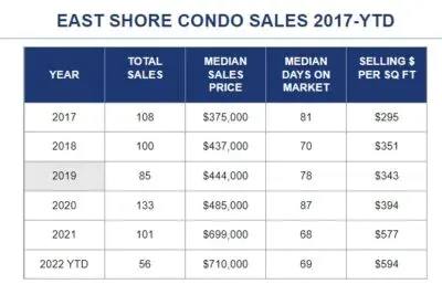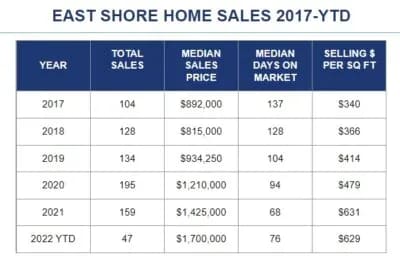 We had no new condos and 3 new homes come onto the market this week. We currently have 34 active condos ranging from $399,000 to $5,425,000; the median condo price is $845,000. We currently have 52 active homes on the East Shore ranging from $1,088,000 to $64,500,000 with the median price of $2,943,500. Here’s a year to date local update: