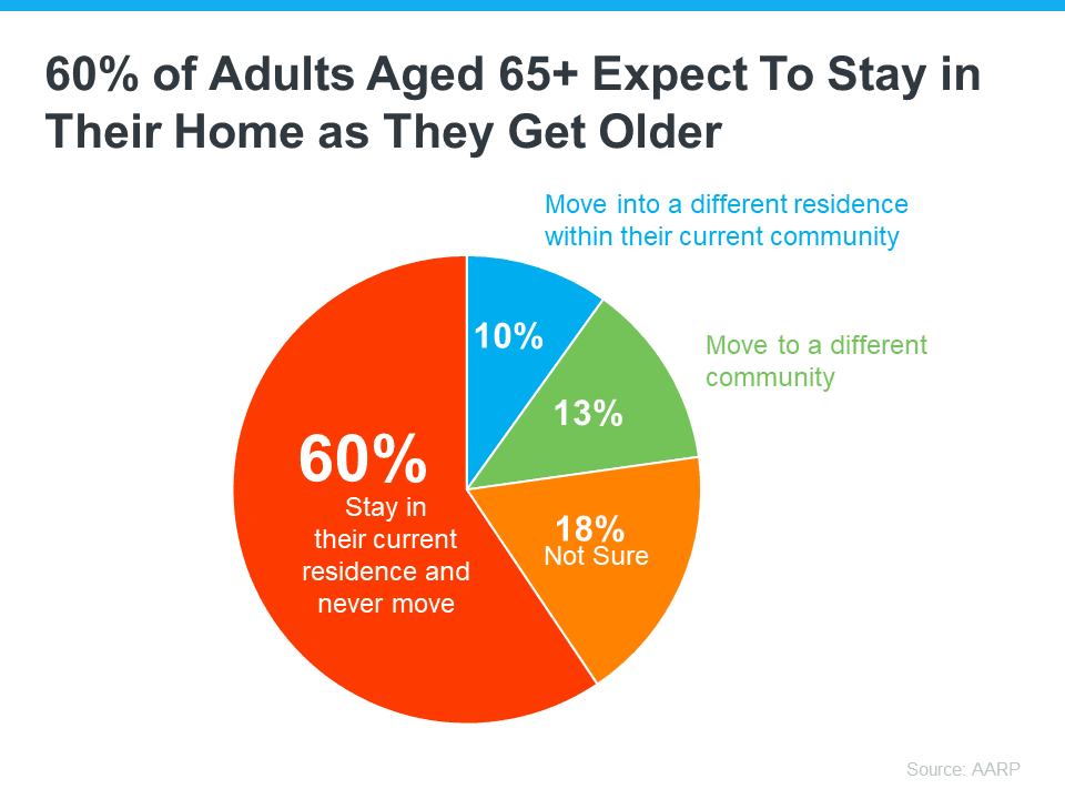 Experts say, so far, a silver tsunami hasn’t happened – and it probably won’t anytime soon. Here’s just one reason why. Many baby boomers don’t want to move. Data from the AARP shows over half of the surveyed adults ages 65 and up plan to stay put and age in place in their current home rather than move (see chart below):