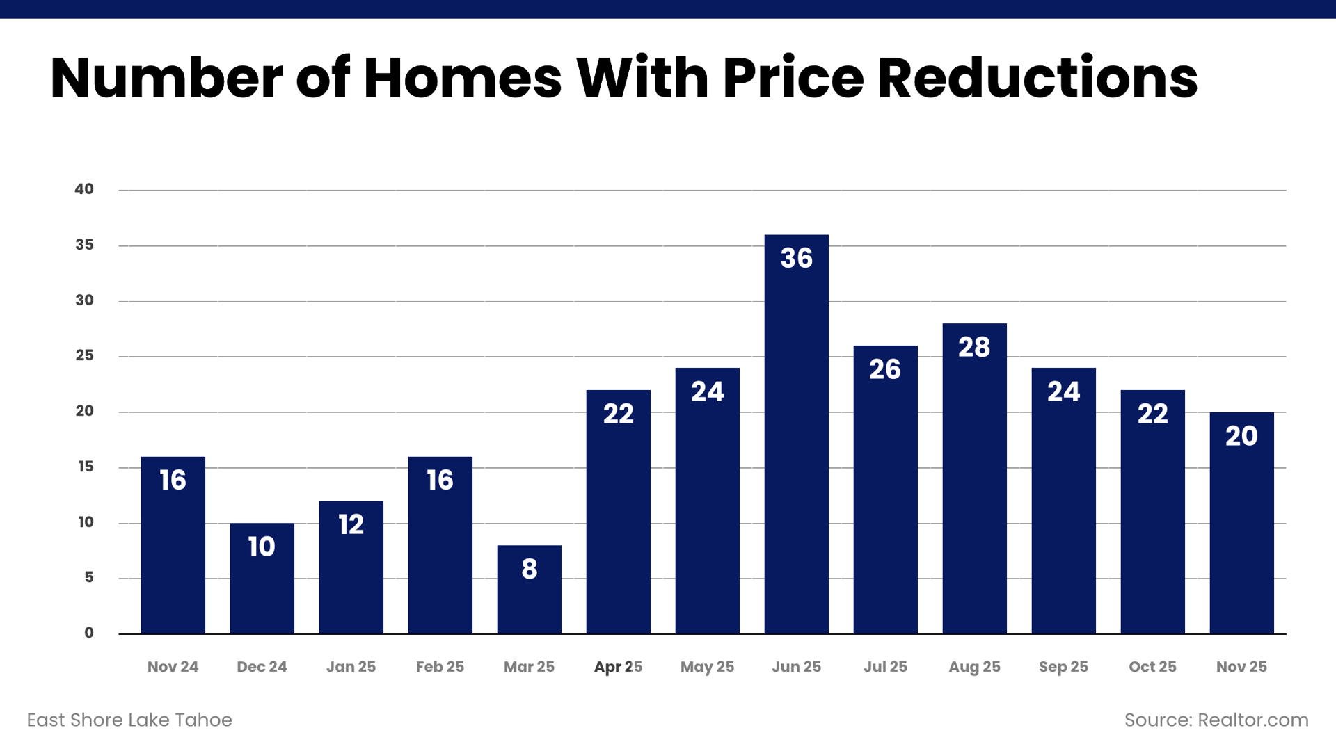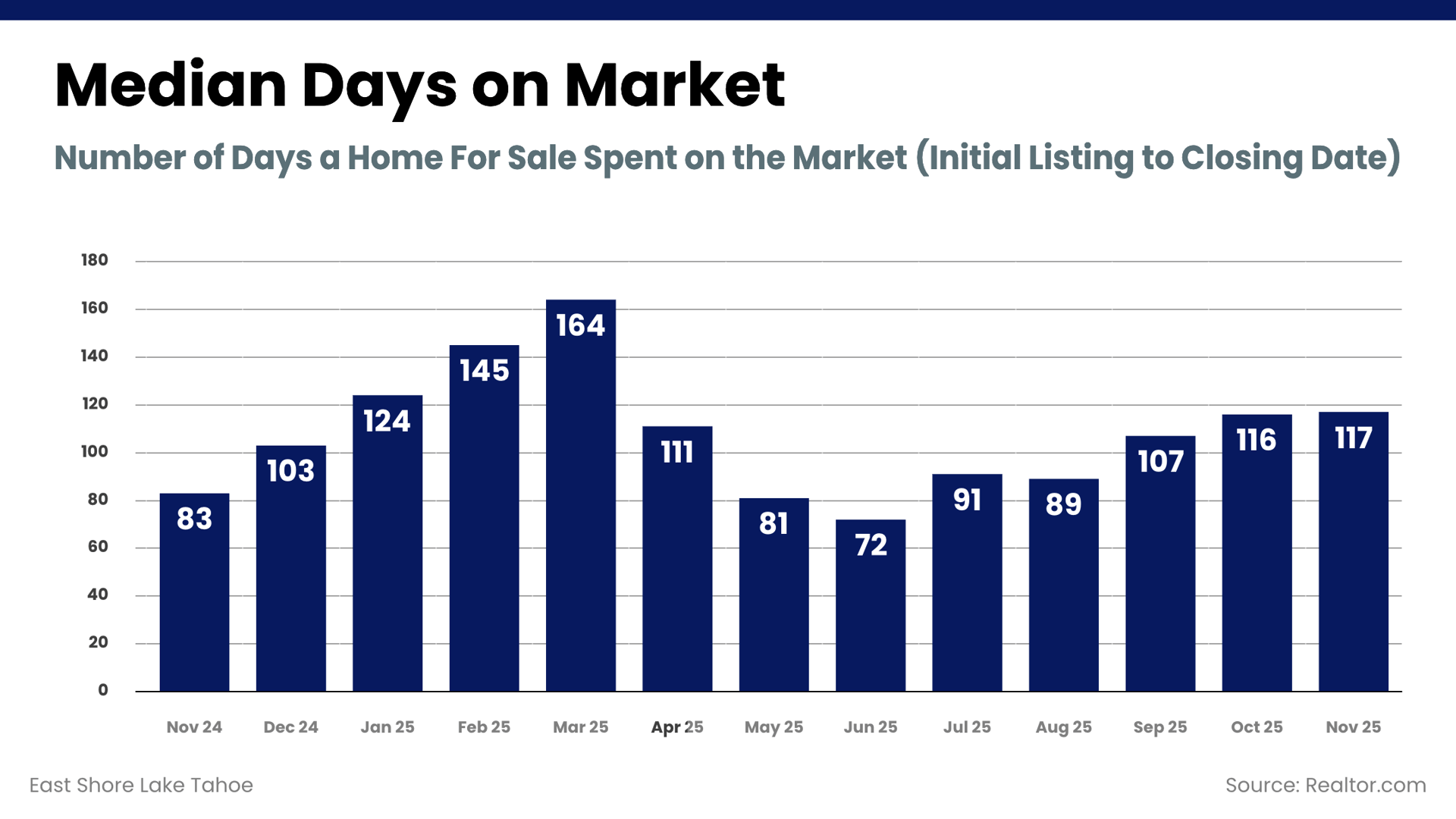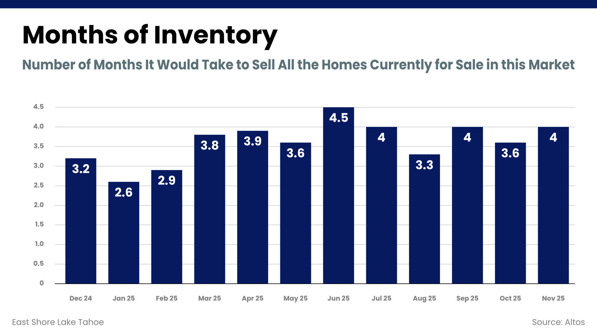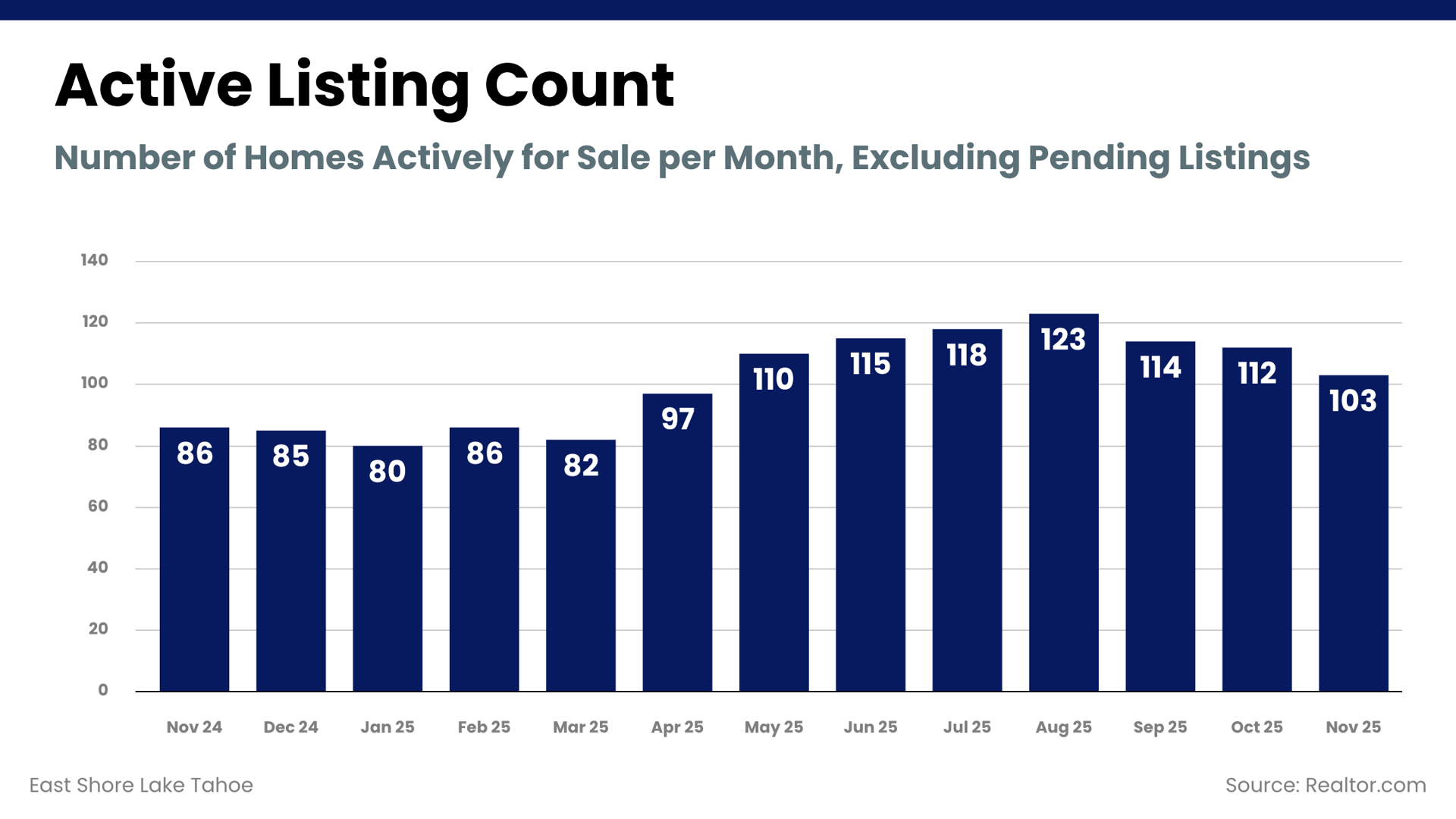 Months of inventory rose modestly and now sits higher than last year, reflecting a more balanced East Shore Lake Tahoe housing market. This level of inventory provides buyers with additional breathing room while still supporting sellers who price strategically. Overall, market leverage remains relatively neutral as winter approaches.