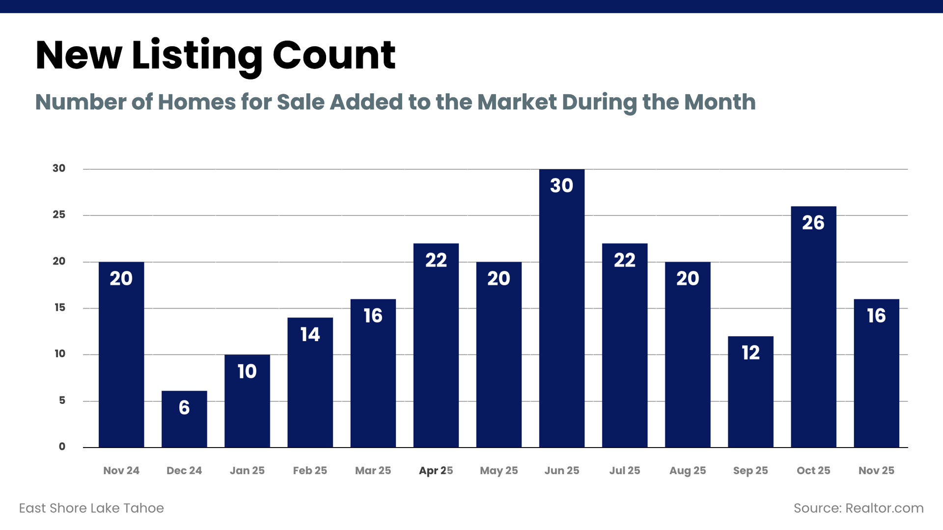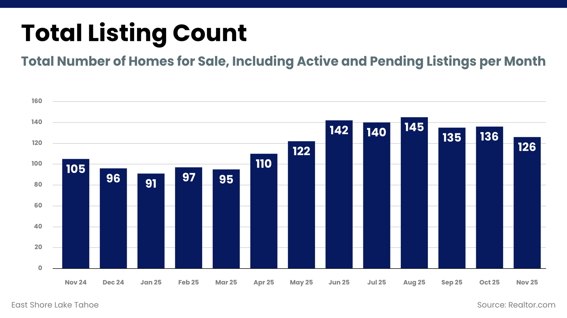 The overall listing pool narrowed slightly month over month but remains significantly larger than last year. This expanded year-over-year supply allows buyers to make clearer comparisons between similar East Shore Lake Tahoe properties. Sellers continue to benefit from visibility, but pricing must stay aligned with current comparable sales to remain competitive.