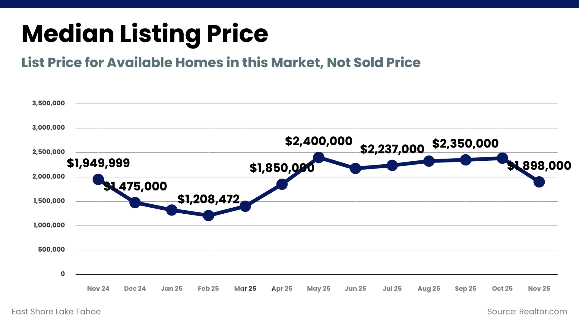 Median listing prices followed a similar pattern, reflecting inventory composition rather than broad price erosion. Buyers evaluating East Shore Lake Tahoe luxury real estate should rely on micro-market comparisons, as pricing varies significantly by condition, views, and proximity to the lake.