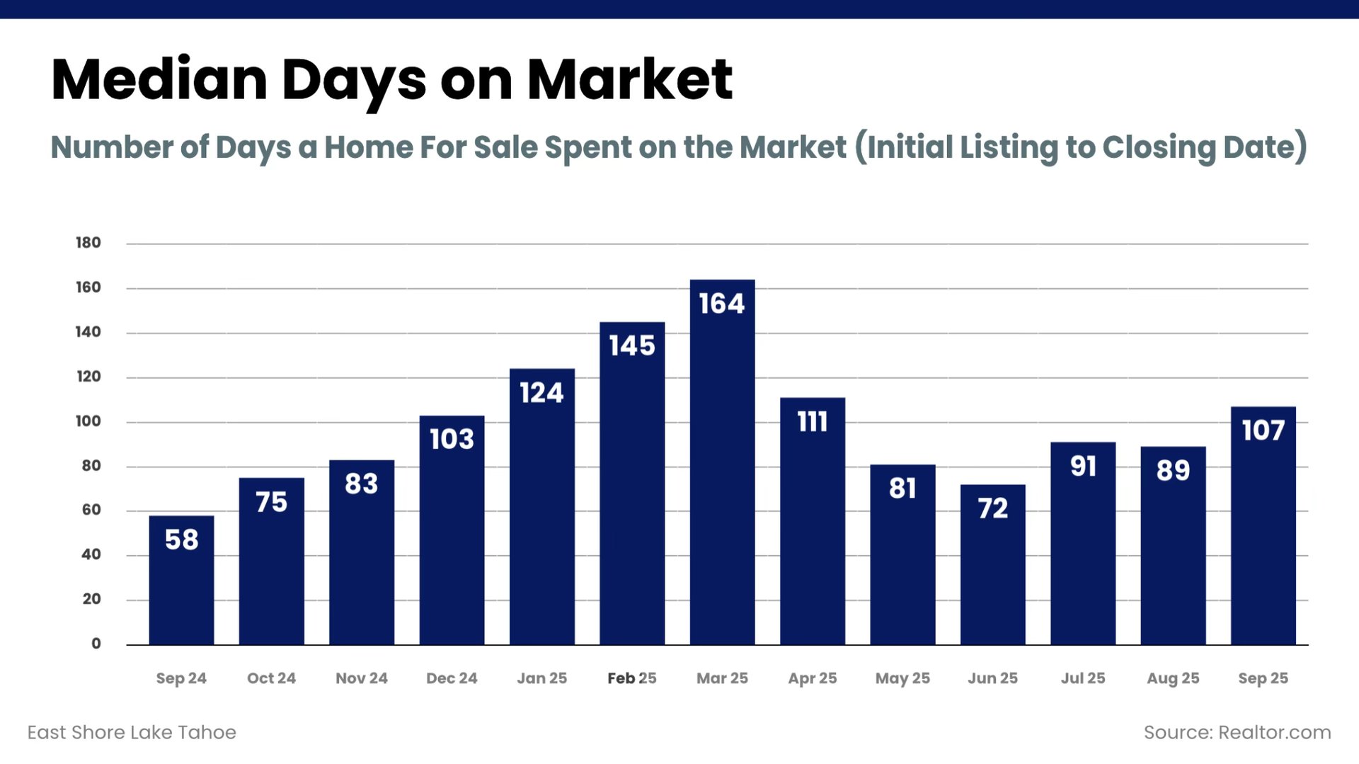The median number of days a home spent on the market increased to 107 in September, following two months of quicker summer sales. While this uptick indicates a gradual slowing, it remains consistent with historical fall pacing. Buyers are taking more time to compare listings, but demand remains steady for well-presented properties priced accurately for today’s Lake Tahoe housing market conditions.