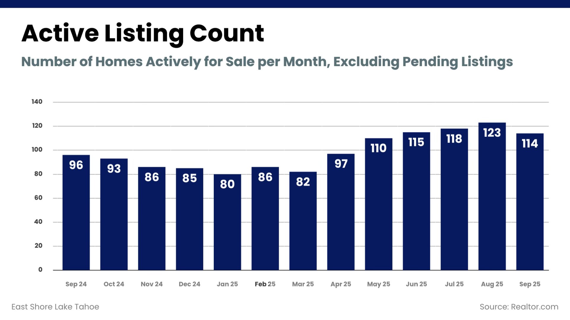 Active inventory on the East Shore of Lake Tahoe decreased slightly in September, marking a normal seasonal cooldown after August’s late-summer peak. Even with this dip, the 114 available homes represent stronger supply than last year’s 96 listings, offering buyers greater selection. Sellers remain positioned well, with steady interest continuing across nearly all price points.