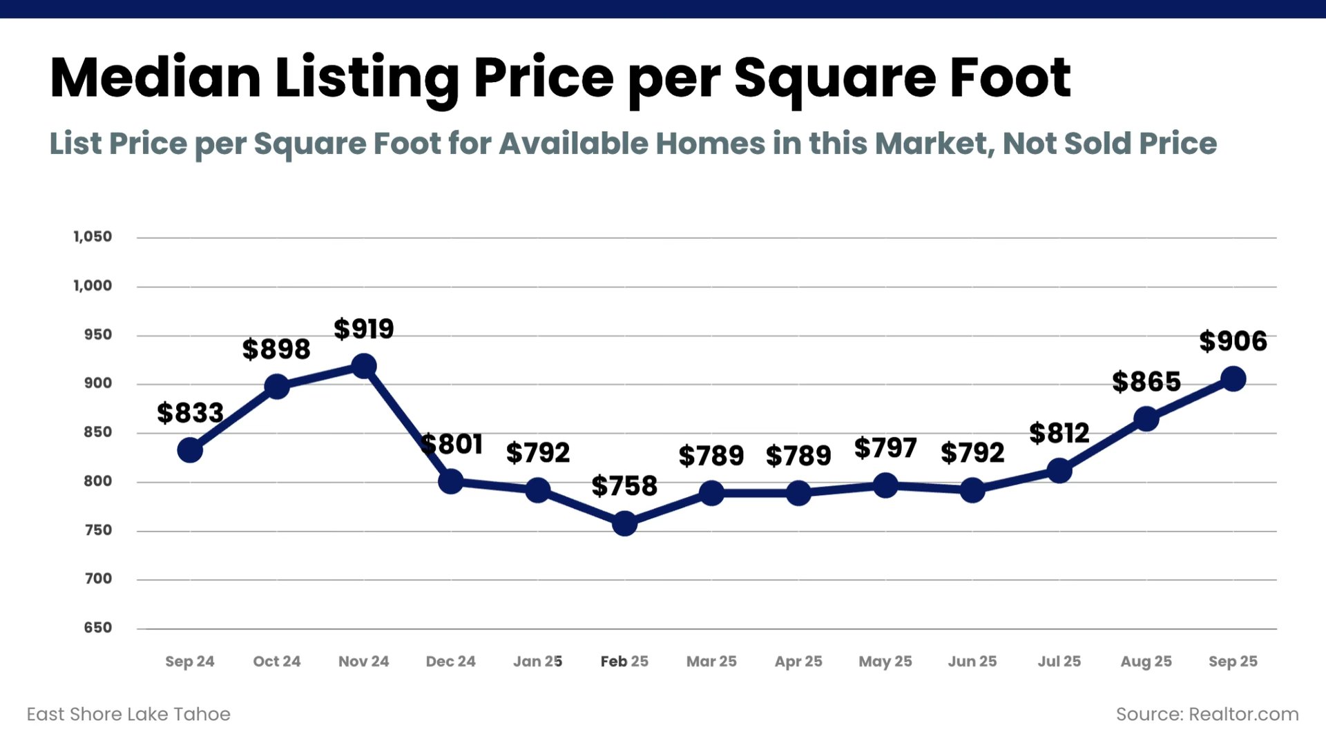 Price per square foot rose to $906 in September—the highest level recorded in 12 months. This metric highlights the enduring value of East Shore Lake Tahoe real estate, where limited buildable land and premium lake access sustain strong per-foot pricing. Year-over-year appreciation of nearly 9% reflects continued buyer willingness to invest in quality homes within this sought-after market.