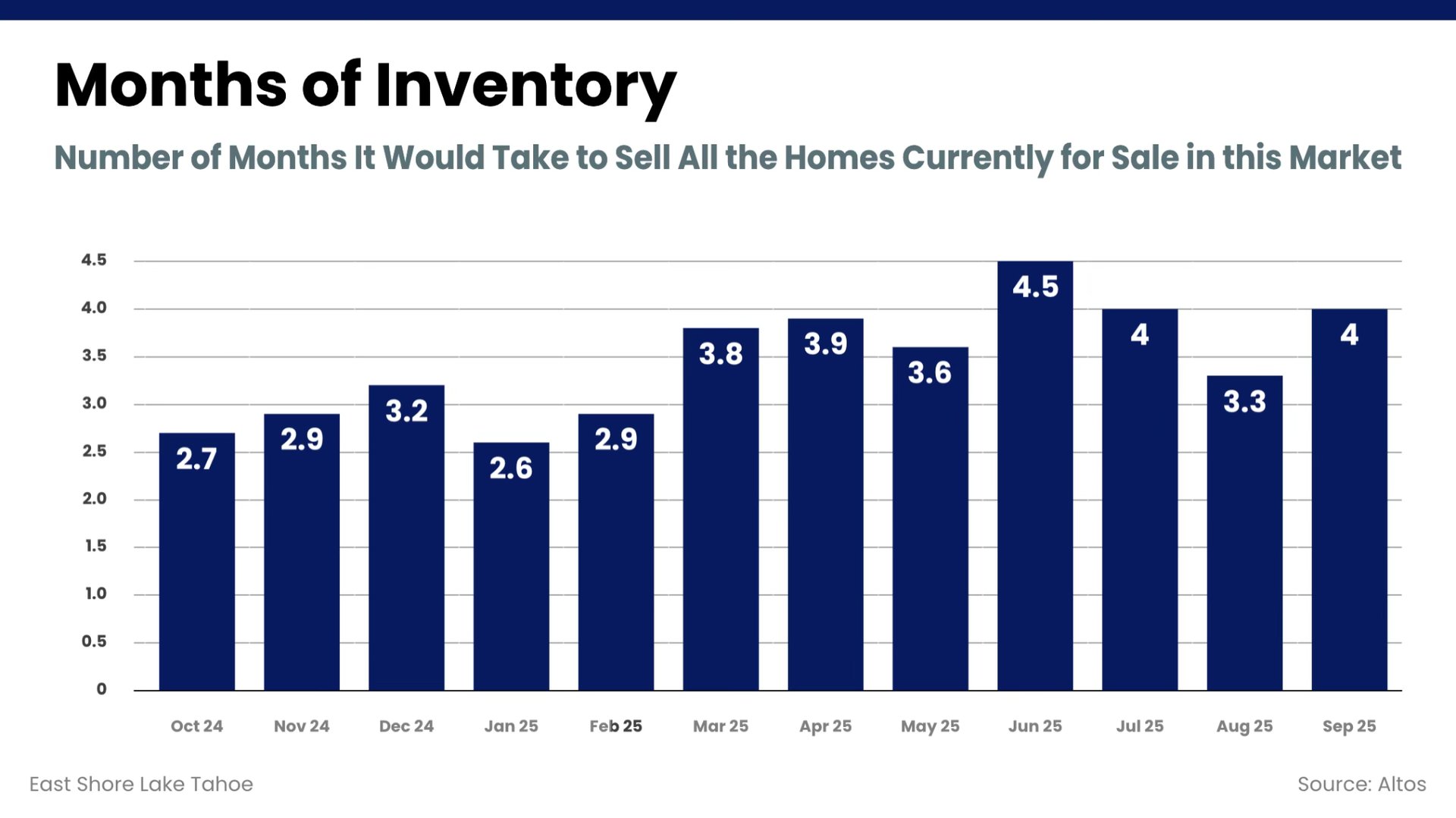 The East Shore now sits at four months of inventory—an equilibrium point favoring neither buyers nor sellers. After summer’s tighter conditions, this balanced level represents a healthy normalization for the region. The metric suggests that supply and demand are aligned, supporting sustainable price growth without overheating the Tahoe real estate market.