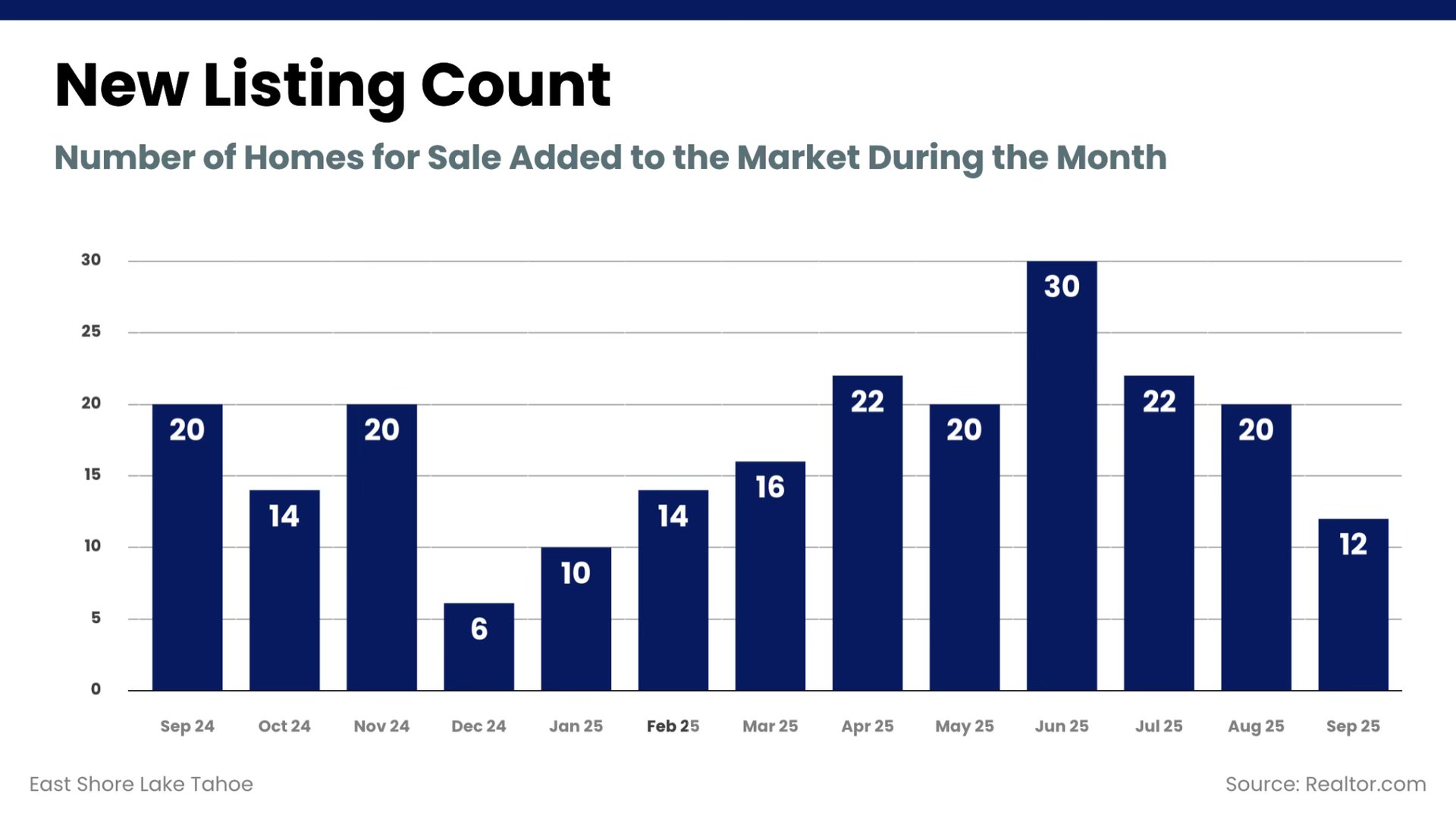 September saw fewer new listings enter the market, reflecting a typical seasonal decline as sellers prepare for the slower fall cycle. With just 12 homes added, this marks one of the smallest monthly intakes of 2025. While volume is lower, reduced competition among listings benefits current sellers, as motivated buyers maintain focus on available East Shore Lake Tahoe homes for sale.