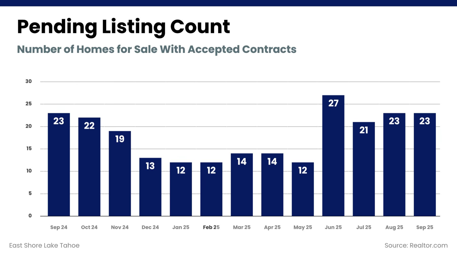 The number of homes under contract held firm at 23, matching both August and last September. This consistency reinforces the strength of ongoing buyer engagement in the Lake Tahoe real estate market, even as new inventory slows. Well-priced properties continue to move efficiently, especially those offering lake proximity or updated interiors.