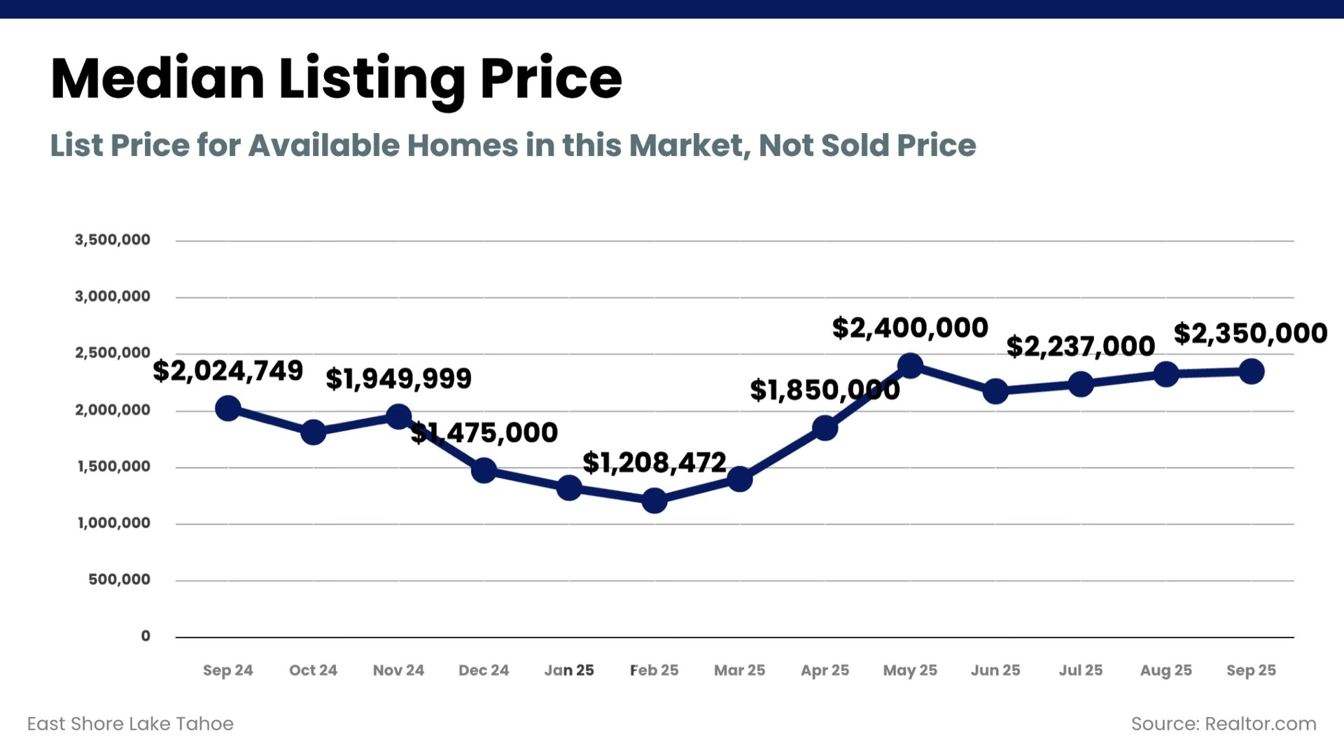 The median home price on Lake Tahoe’s East Shore climbed again in September, reaching $2.35 million. This marks a continuation of upward movement that began in early summer. The increase underscores persistent demand for high-quality properties, particularly within gated or lake-adjacent neighborhoods. Overall pricing stability signals confidence among both buyers and sellers as the market moves into Q4.