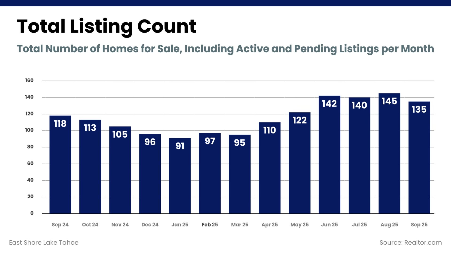 Total inventory—which includes both active and pending homes—declined modestly from August’s 145 to 135 in September. Despite the monthly dip, this is notably higher than the 118 listings at the same time last year. The Lake Tahoe housing supply remains healthy and balanced, supporting a stable environment for negotiations and long-term investment.